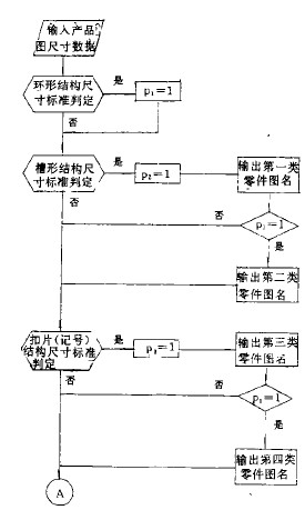 標準判定軟件的程序框圖如圖6 和圖7 所示。圖中的PI 、 PZ 、 P3 分別是產品圖的環形結構, 槽形結構和扣片(記號) 形結構的標準特征值。如結構尺寸判定為標準, 則等于1 , 反之為0。 P 1 、 P2 和P3 的組合形式見表1 。