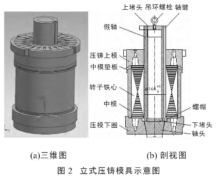圖2為轉(zhuǎn)子壓鑄模具裝配示意圖,其中圖(a)為該模具的三維視圖,圖(b)為該模具的剖視圖。該模具具有重量輕,造價低,通用性好,可以同時滿足不同很數(shù)(2~8很)、不同高度的轉(zhuǎn)子沖片的壓裝。